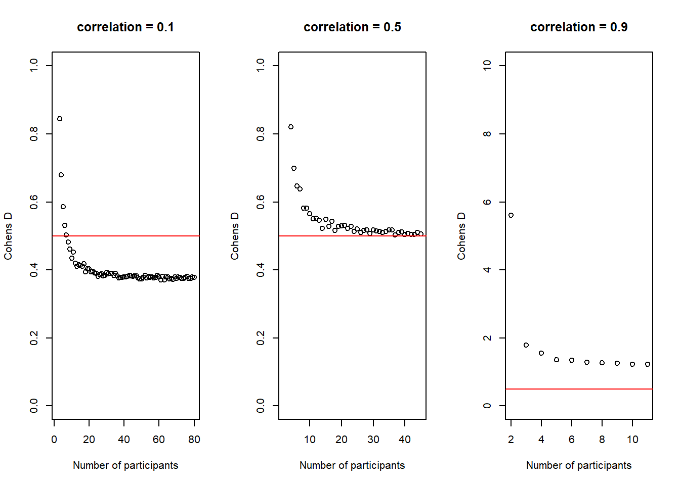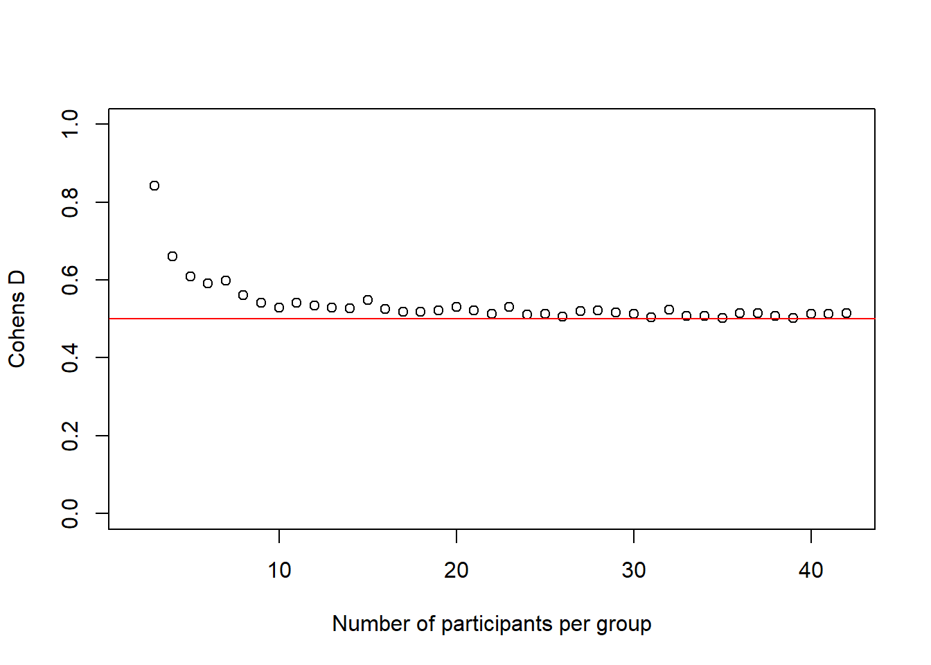 plot(2:(n-1), cohens_ds_at_n, xlab = "Number of participants per group", ylab = "Cohens D", ylim = c(0.0,1.0), axes = TRUE) abline(h = .50, col = "red")