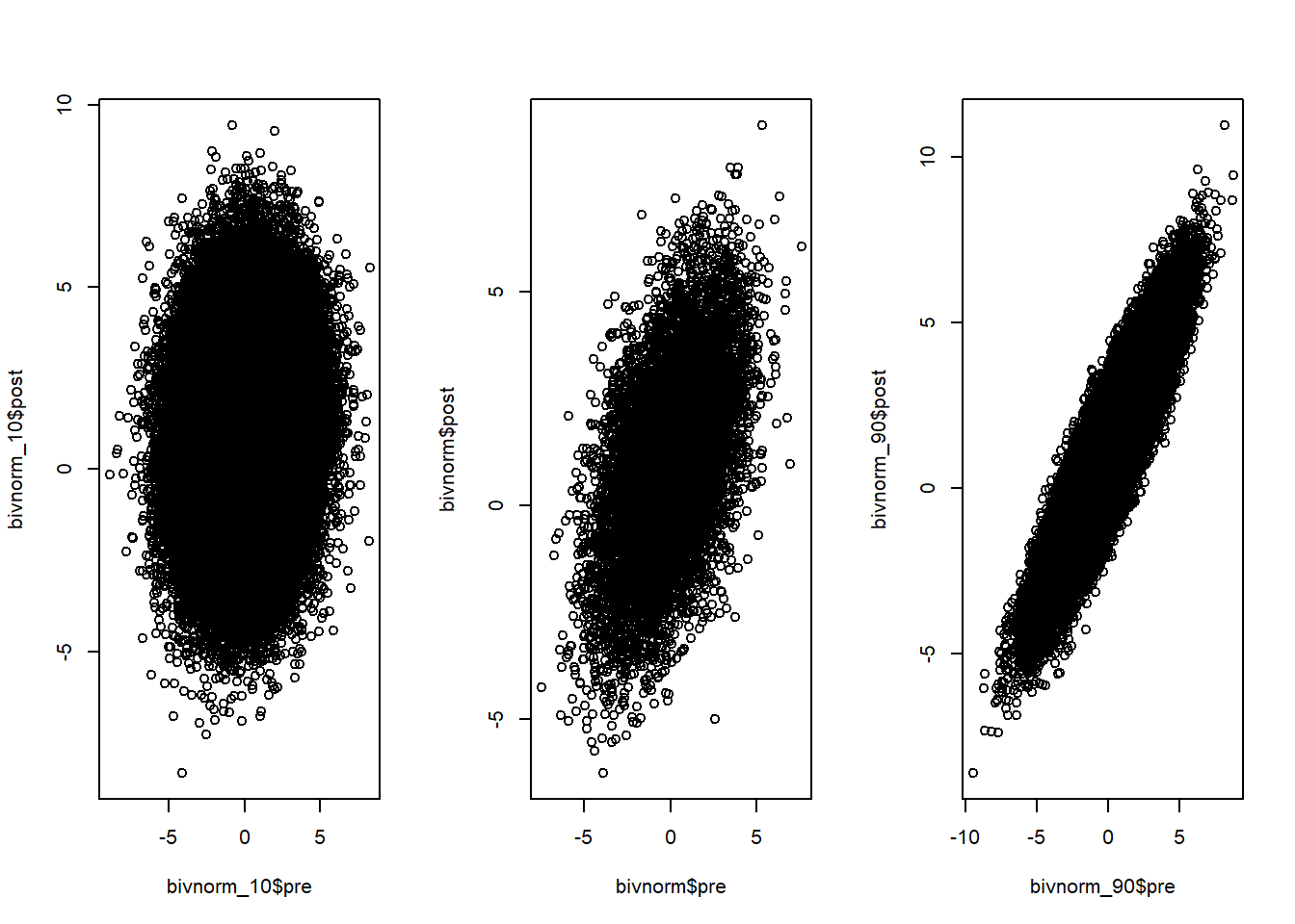 Thus, there is a correlation between the pre- and the post-measures in that the pre-measures already tell us a little bit about what we can expect on the post-measure. You probably already knew this but why does this matter for power simulation, you might wonder. It matters as it directly influences our power to detect an effect as we will see later. For now let’s just keep in mind that it is important.