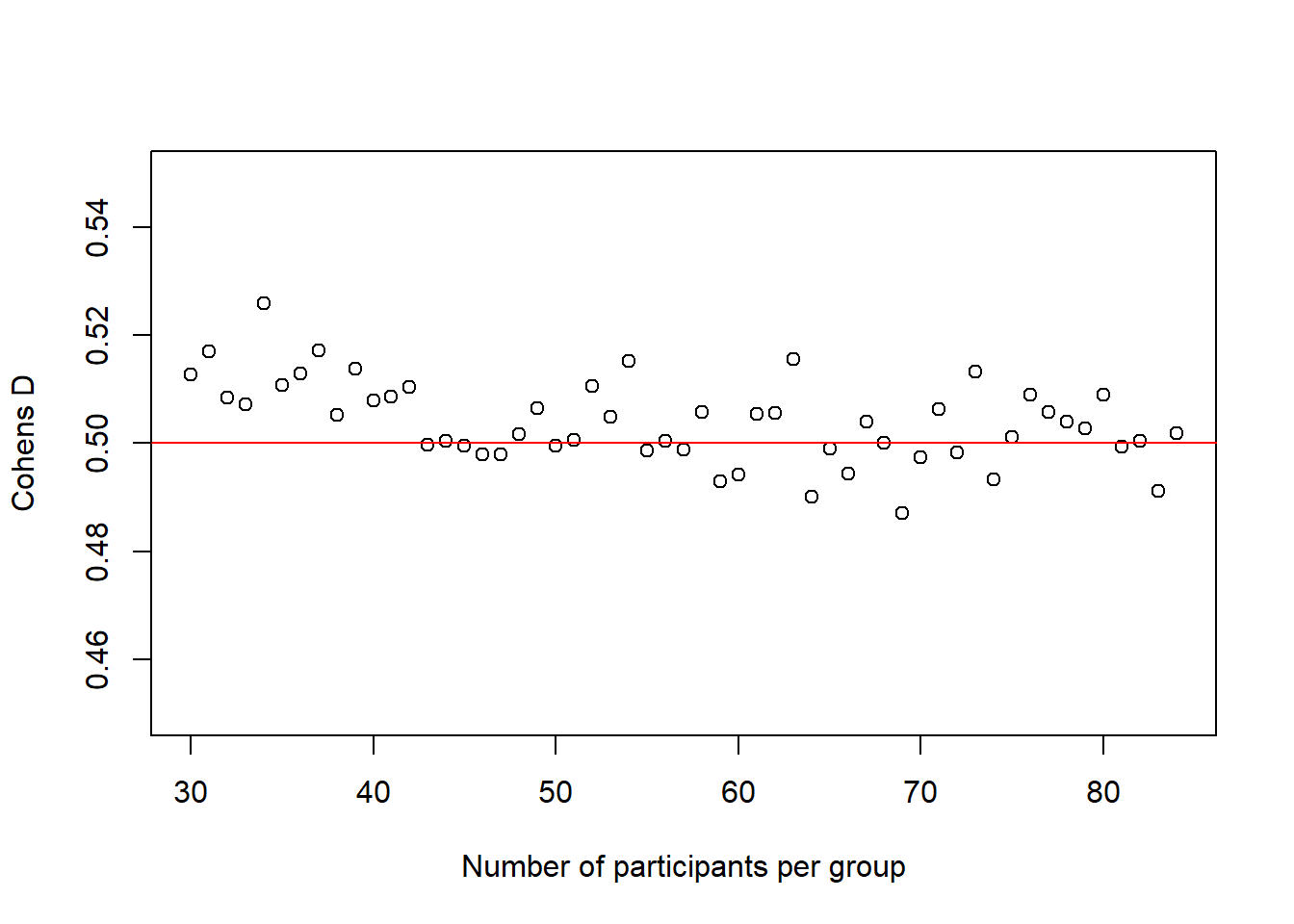 plot(30:(n-1), cohens_ds_at_n, xlab = "Number of participants per group", ylab = "Cohens D", ylim = c(0.45,0.55), axes = TRUE) abline(h = .50, col = "red")