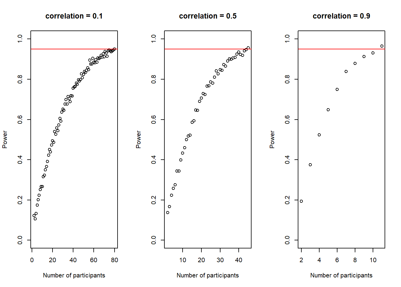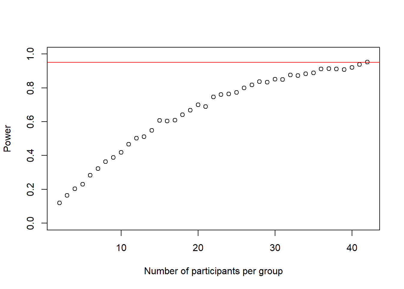 plot(2:(n-1), power_at_n, xlab = "Number of participants per group", ylab = "Power", ylim = c(0,1), axes = TRUE) abline(h = .95, col = "red")
