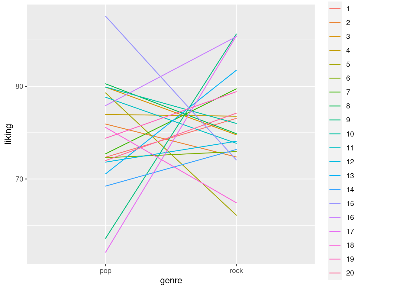 Nice! Indeed our data has 20 rows, and each participant listens to rock and pop once - exactly what we wanted.