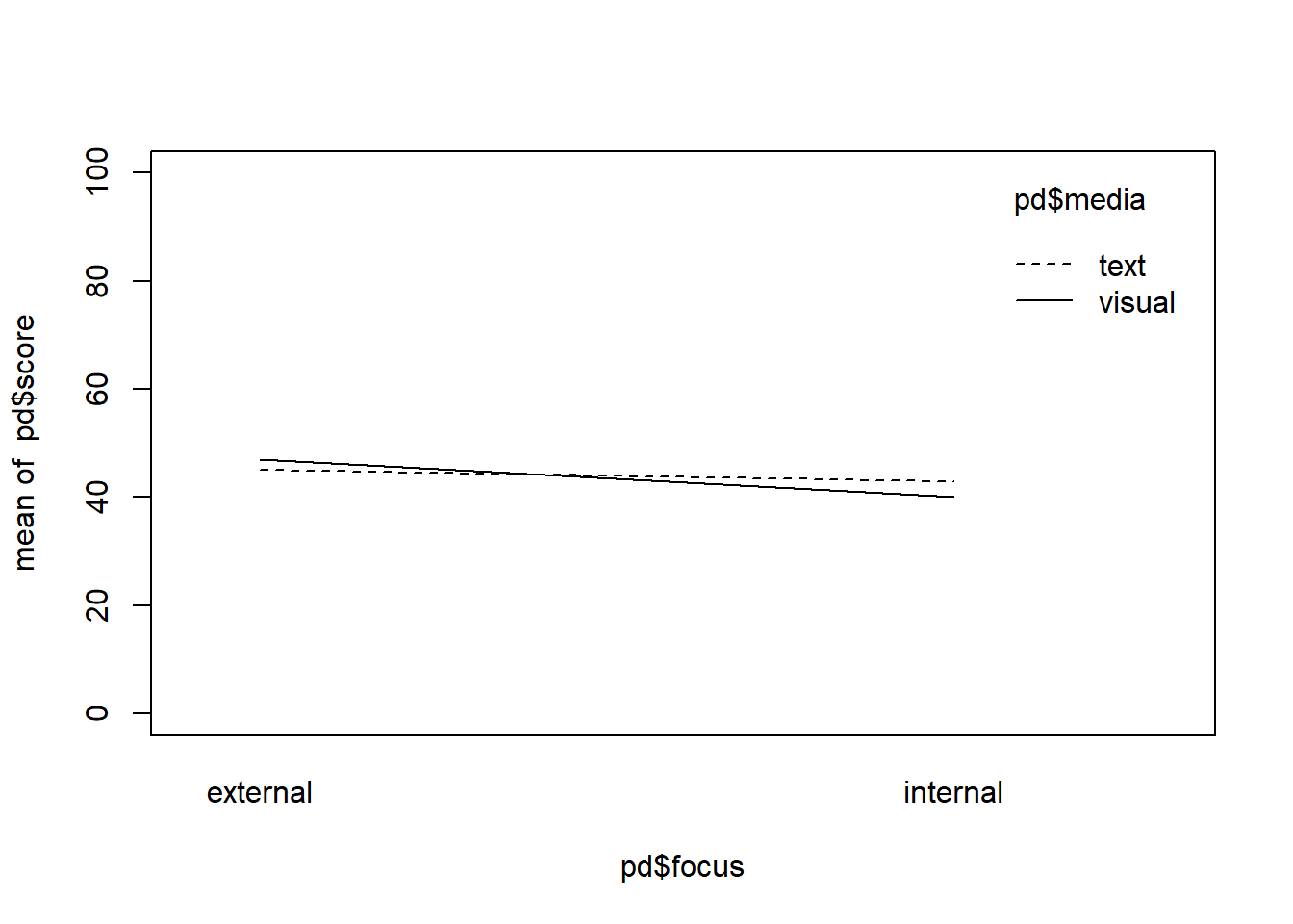(mean(aov_dat$score[aov_dat$focus == "internal"])-mean(aov_dat$score[aov_dat$focus == "external"]))/sqrt((sd(aov_dat$score[aov_dat$focus == "internal"])^2+sd(aov_dat$score[aov_dat$focus == "external"])^2)/2)= -0.2824849 media:(mean(aov_dat$score[aov_dat$media == "text"])-mean(aov_dat$score[aov_dat$media == "visual"]))/sqrt((sd(aov_dat$score[aov_dat$media == "text"])^2+sd(aov_dat$score[aov_dat$media == "visual"])^2)/2)= 0.0281052↩︎
